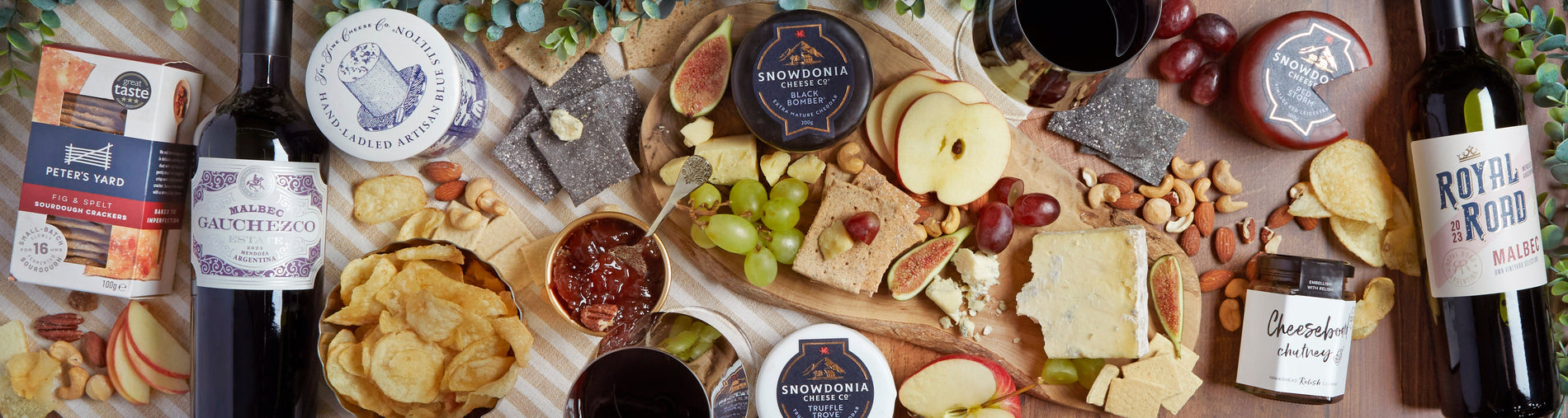 Our hampers include quality cheeses from British producers. The Snowdonia Cheese Company and The Mouse House Cheese Company, to name a couple! Both of these producers make outstanding, creamy cheddar cheese truckles, including a few of our favourites: Snowdonia’s ‘Black Bomber’ extra mature cheddar and Mouse House’s finest vintage English cheddar and caramelised onion cheddar, which all pair perfectly with a glass of red or white wine.